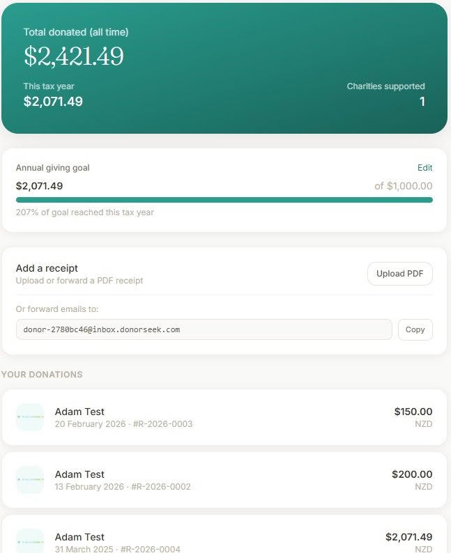 DonorSeek helps New Zealand charities manage donors and issue receipts automatically — and gives donors one place to keep their giving record for tax time.