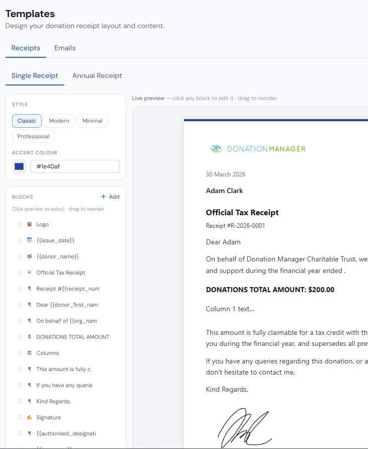 Four customisable templates — add your logo, colours, and a personal message. Generate individual receipts in seconds.